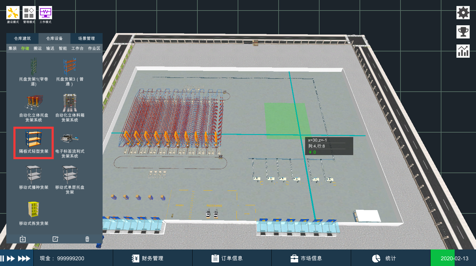 系統基于物流中心從入庫到出庫的整個(gè)作業(yè)環(huán)節,內置了多種倉儲與分揀設施設備,包括一些先進(jìn)的倉儲設施設備資源,比如AGV、自動(dòng)驗收機、揀貨機器人、自動(dòng)碼垛機、全自動(dòng)折蓋封箱機等先進(jìn)的智能設備;讓學(xué)生可根據需求,多樣靈活的規劃設計自己的倉庫。